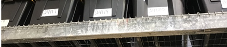 Contrairement aux composants peints où une décoloration brunâtre apparaît à toutes les étapes, les composants galvanisés ne commencent à montrer des signes de cette décoloration qu'à la deuxième étape du processus. Bien que la décoloration brune soit à son stade initial, la décoloration blanche s'est étendue pour couvrir une plus grande surface du composant du palettier tout en ayant un aspect poudreux. Tout comme les composants non galvanisés, si la partie galvanisée a perdu 10% de son épaisseur, elle doit être remplacée.